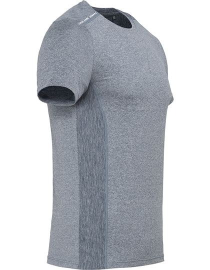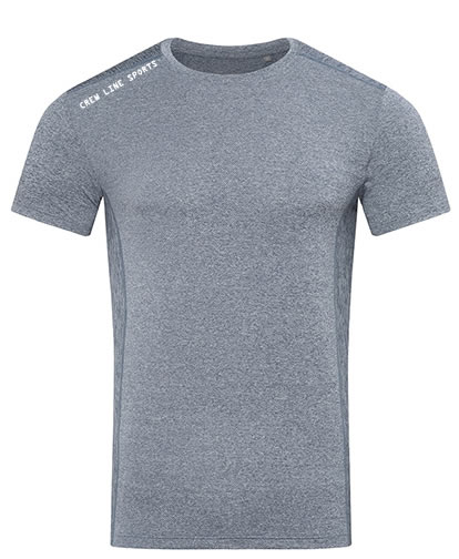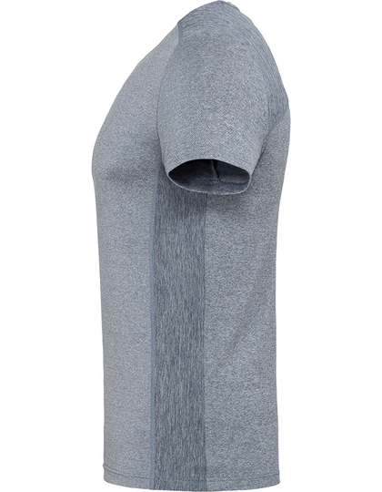 T-SHIRT HOMME RACE RECYCLE. 160 g/m² Matière :90% polyester ACTIVE-DRY° (50% recyclé), 10% élasthanne tissu filet très élastique et aéré effet chiné avec des éléments contrastants tissu écologique, fabriquée à partir de 4 bouteilles en plastique recyclées